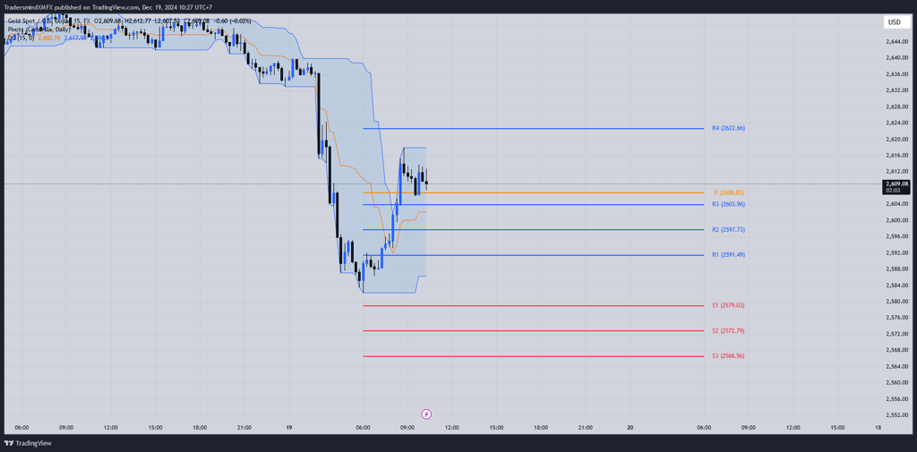 Harga saat ini berada sedikit di atas pivot point utama (2.606,82), menunjukkan adanya potensi pergerakan ke arah resistance jika momentum bullish berlanjut.